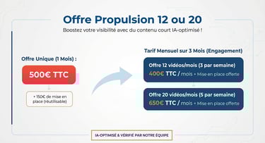 Tarif dégressif sur 3 mois pour avoir 36 à 60 contenus optimisés sur 6 réseaux soit jusqu'à 360 vidéos qui travaillent pour vous 24/24, 7 jours sur 7 avec une audience potentielle de 300 millions de personnes 29 pays.