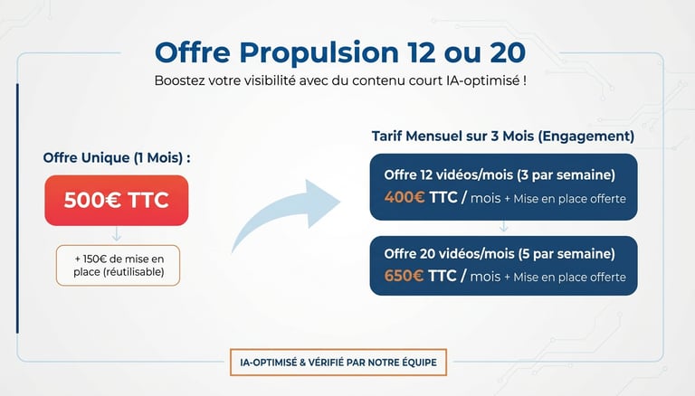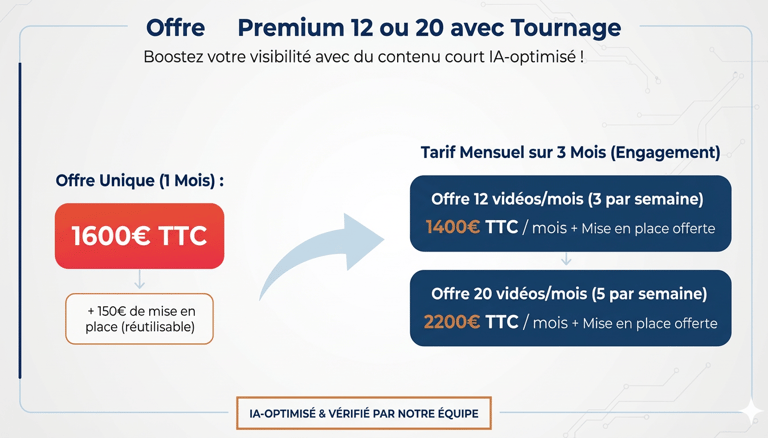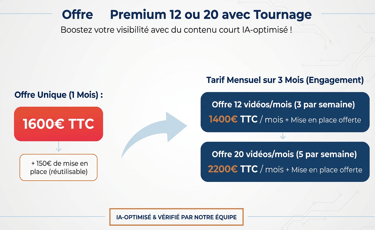 Tarif pour un mois unique pour 12 créations ensemble avec 1 Tournage : 1600€ TTC + mise en place du système : la préparation ensemble des sujets, le tournage, le montage/selection et la diffusion sur tous vos réseaux pour un 12 contenus optimisés, aucune technique pour vous.